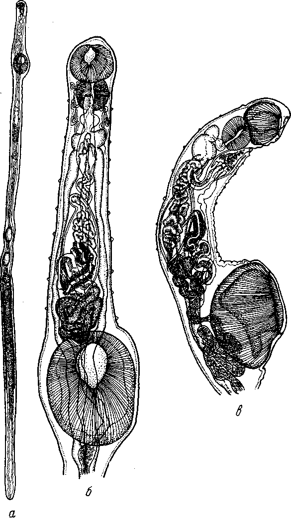a — марита, общий вид; б — передний конец мариты, вентрально; в — передний конец мариты, латерально.