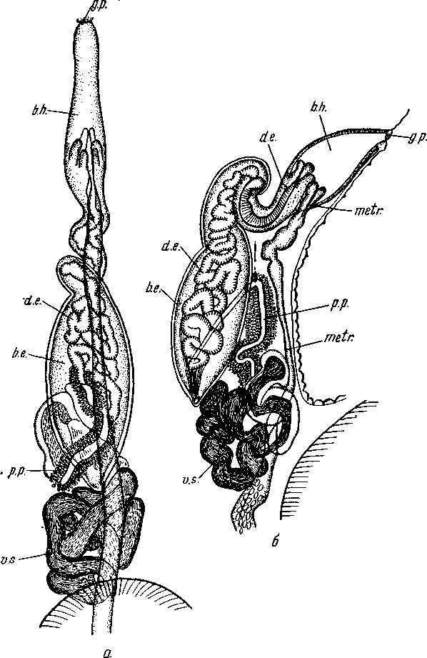 a — терминальный участок полового аппарата, вентрально; б — терминальный участок полового аппарата, латерально; b.e.— семяизвергательная бурса; b. h.— гермафродитная бурса; g. p.— половое отверстие; d. е. — семяизвергательный проток; metr. — матратерм, р. р.— простатическая часть; v. s.— семенной пузырек.