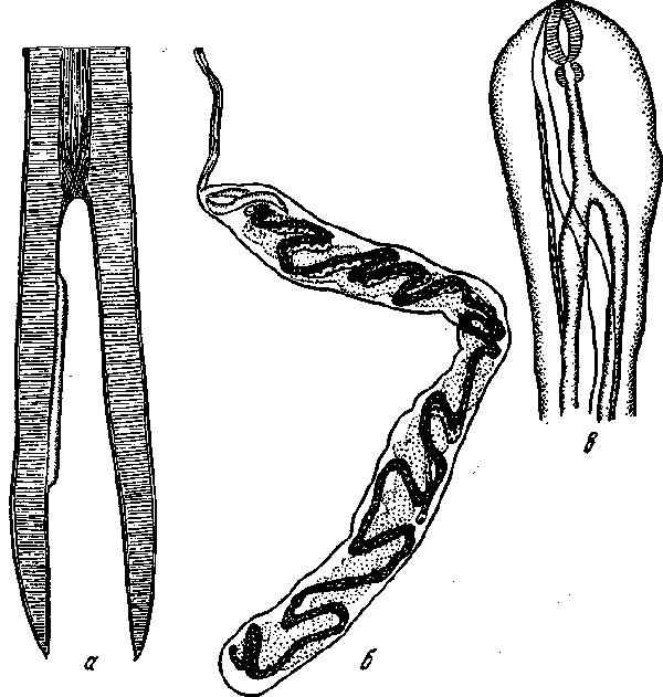 a — циста на жаберном лепестке; б — марита; в — передний конец паразита