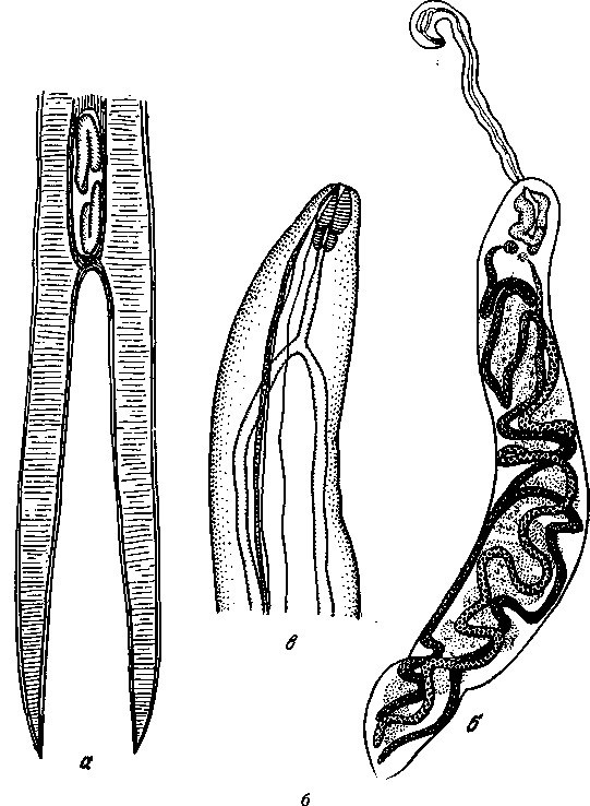 a — циста на жаберном лепестке; б — марита; в — головной конец паразита