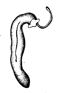Описание вида (по Ямагути, 1938). Передняя часть тела палочковидная, 0,7—1,2 мм длины, сплюснутая дорзовентрально; своей максимальной ширины, равной 0,17—0,3 мм, она достигает впереди середины своей длины. Прикрепляется передняя часть тела к заднему отделу тела непосредственно позади его переднего конца, имеющего медианную бороздку. Почти цилиндрическая, спирально скрученная задняя часть тела достигает 2,8—6,2 мм длины при ширине 0,5—0,7 мм. Терминальная ротовая присоска со слабо развитыми мышцами достигает 0,036—0,05 х 0,039—0,045 мм. Непосредственно за ней следует фаринкс, который равен 0,022—0,03 х 0,022—0,027 мм. Тонкий, слегка извилистый пищевод длиною 0,35—0,56 мм имеет перетяжку у заднего конца. Широкие кишечные стволы тянутся по бокам тела почти до его заднего конца.