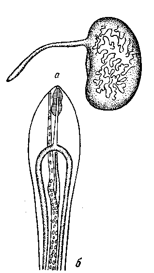 Эти паразиты состоят из двух, резко различающихся между собой частей- задней, расширенной, мешковидной, которой автор дает неправильное наименование брюшной области, и передней, тонкой, нитевидной, которой присвоено название головной части.