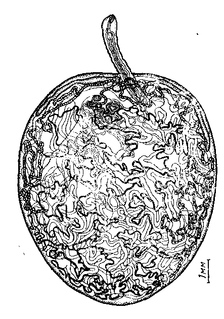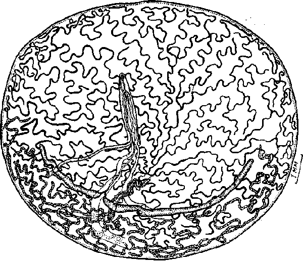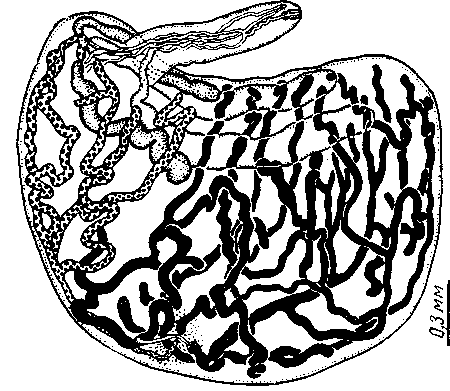 Два гермафродитных паразита в цисте одинакового размера и формы и прилегают один к другому плоской стороной задней части тела. Тонкая передняя часть тела длиною до 6,5 мм выходит из плоской стороны задней части тела близ ее переднего конца. На переднем конце передней части тела существует веретеновидное вздутие, максимальная ширина которого на уровне пищевода достигает 0,63 мм. На более или менее заостренном переднем конце расположен рот, на дне которого лежит грушевидная ротовая присоска, достигающая 0,09—0,11 мм длины и 0,072—0,081 мм ширины. Боченковидный фаринкс 0,096—0,12 X 0,075— 0,1 мм. Пищевод тонкий, длиною 0,35—0,53 мм. Проникнув в заднюю часть тела, кишечные стволы сильно вздуваются и расходятся к латеральным краям тела, где идут извилистым ходом между лежащими дорзально половыми органами и вентрально экскреторным пузырем, оканчиваясь по обеим сторонам медианной линии.