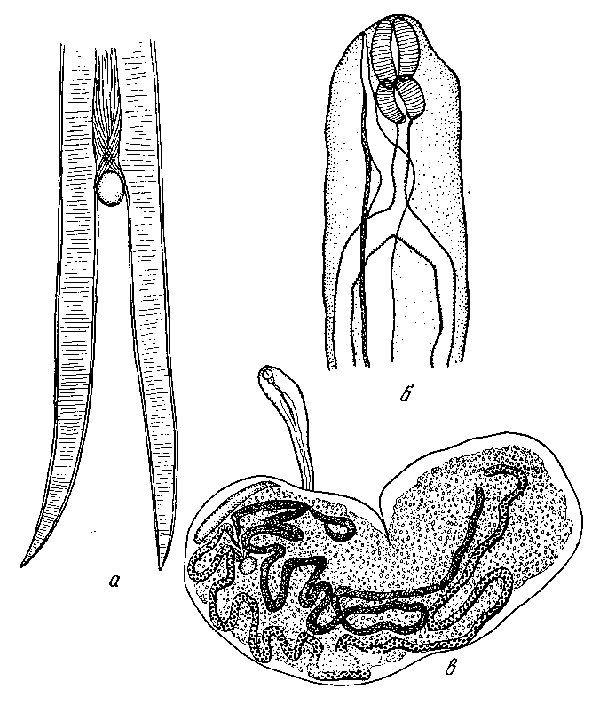 а - циста на жаберном лепестке; б — головной конец паразита; в — марита
