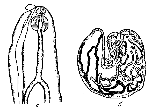 Ротовая присоска эллиптическая или овальная, усеченная сзади, 0,2—0,26 X 0,16—0,21 мм; просвет ее очень узок. Фаринкс яйцевидный, с усеченным передним концом, 0,125—0,175 х 0,11—0,188 мм. Тонкий пищевод длиною 0,55—0,82 мм снабжен нервной комиссурой на дорзальной стороне его передней части. Кишечные стволы, обычно очень узкие в переднем отделе тела, расширяются, перейдя в задний отдел тела, где тянутся сильно извилистым ходом между лежащими дорзально половыми органами и расположенным вентрально экскреторным пузырем.
