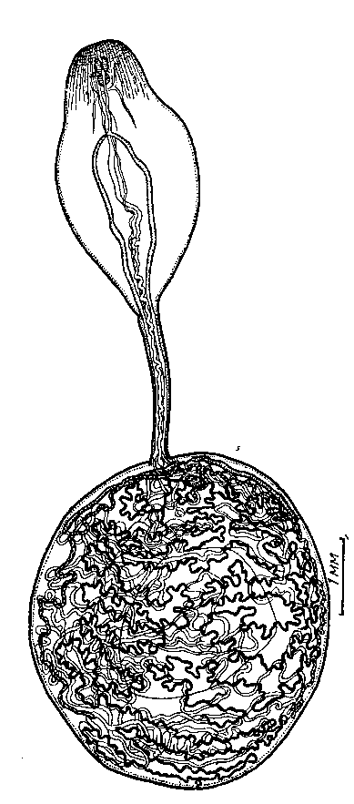 Описание вида (по Ямагути, 1938). Два гермафродитных экземпляра одинакового размера заключены в шаровидную цисту, соприкасаясь между собой плоской вентральной стороной заднего отдела тела. Передний отдел тела длиною до 8 мм сильно сплюснут дорзо-вентрально и расширен латерально, достигая 2,5 мм ширины на уровне бифуркации кишечных стволов. Полушаровидный задний отдел тела 7,5 мм длины, 4,5 мм ширины и 4 мм толщины. Рот воронковидный, терминальный, с наклоном в вентральную сторону, достигает 0,25—0,3 мм ширины; он снабжен хорошо развитыми радиальными мышечными волокнами, переходящими в субкутикулярный мышечный слой переднего отдела тела.