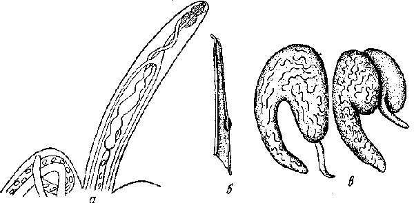 а — головной конец; б — жаберный лепесток о цистой; в — мариты