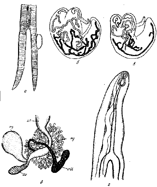 a — диета на жабрах; б и в — мариты; г — головной конец; 9 — комплекс половых элементов; ut — матка; Mg — тельце Мелиса; vit — желточник; ov — яичник; rs — семяприемник