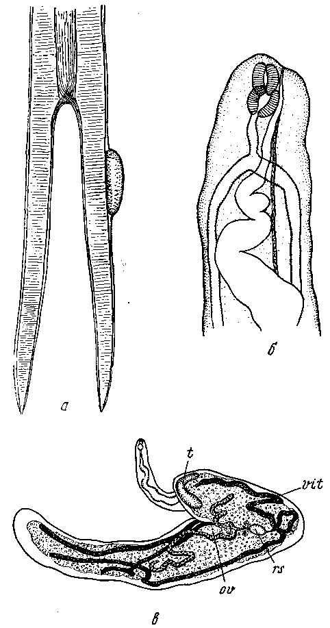 a — циста на жабрах; б — головной конец; в — марита: ov — яичник; t — семенник; vit — желточник; rs — семяприемник
