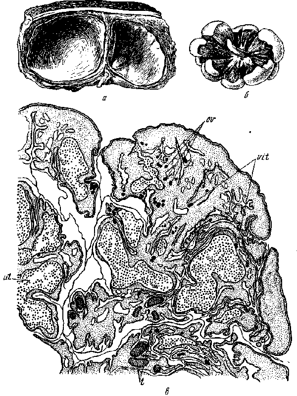 а — внутренняя полость цисты; б —общий вид мариты; в —разрез одной лопасти мариты: ut — матка; t — семенник; ov — яичник; vit — желточник
