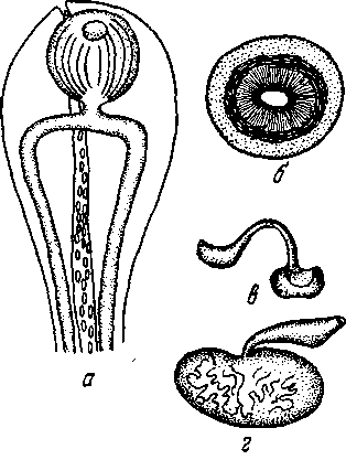 a — головной конец; б — ротовое отверстие; в — самец; г — самка