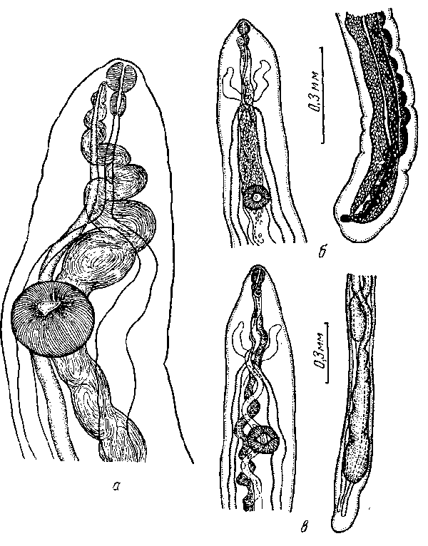 a — головной конец самца; б — головной и хвостовой концы самки; в — головной и хвостовой концы самца