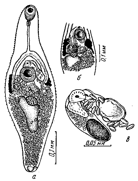 a — марита; 6 — средняя часть тела; в — концевой отдел половых органов