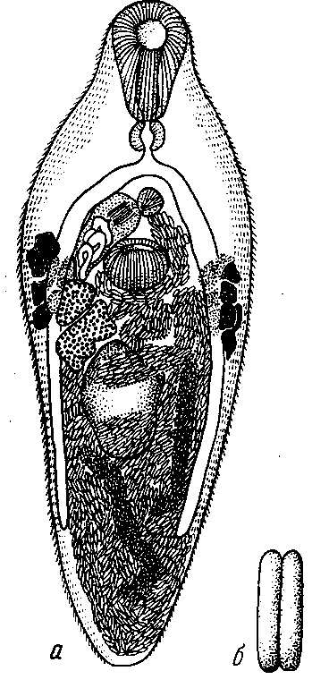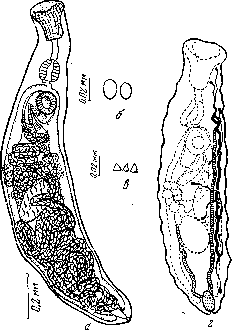 a — марита; б — яйца; в — шипы; г — экскреторная система