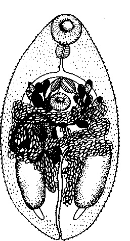 Два семенника лежат латерально от средней линии тела — справа и слева — соответственно. Располагаются они около середины расстояния между брюшной присоской и задним концом тела. Края семенников неправильно лопастные. Семяприемник не обнаружен. Яичник непосредственно перед правым семенником, частично под его передним концом. Ветви матки в задней половине тела, частично в пространстве между семенниками. Матка кончается впереди приблизительно у середины медианной стороны метратерма. Последний относительно толстостенен и покрыт шипами по всей своей внутренней поверхности. Он велик, его размеры приблизительно 0,0332 мм длины и около 0,0224 мм ширины, и лежит в левой половине тела.