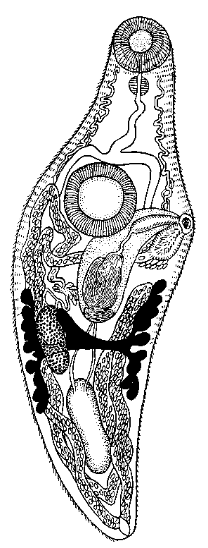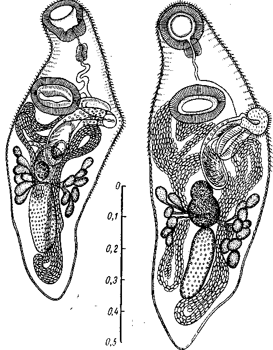 Cercariaeum limnaeae-auriculariae de Filippi, 1857 (по Везенберг-Лунду, 1934 из Сцидата, 1943). Предполагаемая личиночная форма Asymphylodora imitans Miihling, 1898