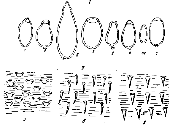 I. Яйца: а — Asymphylodora tincae; б — A. carpiae; в — A. imitans, г — A. expinosa; д — A. ferriginnsa; е—A. demeli; ж — Palaeorchis incognilus; з — P. unicits.