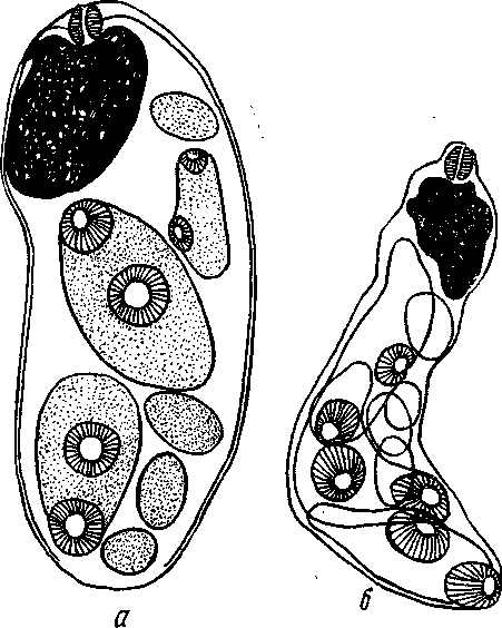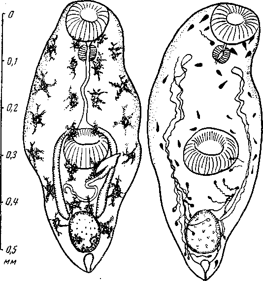 а — Cercariaeum paludinae-impurae Wesenberg-Lund, 1934 (по Beзенберг-Лунду, 1934 из Сцидата, 1943); б — Cercariaeum helveticum I Dubois, 1929 (по Дюбуа, 1929 из Сцидата, 1943)