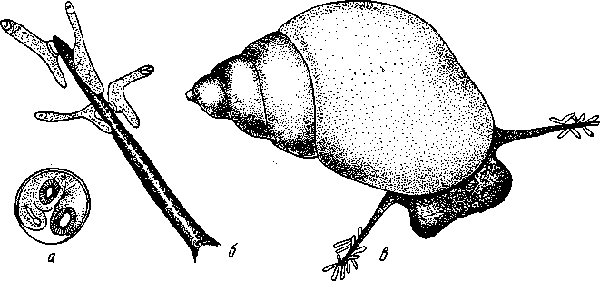a — циста из Bithynia tentaculata; б — щупальцы моллюска с церкариями; в — церкарии в характерных положениях, сидящие на щупальцах моллюска