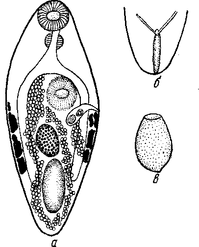 a — общий вид; б — задний конец тела с экскреторным пузырем; в — яйцо