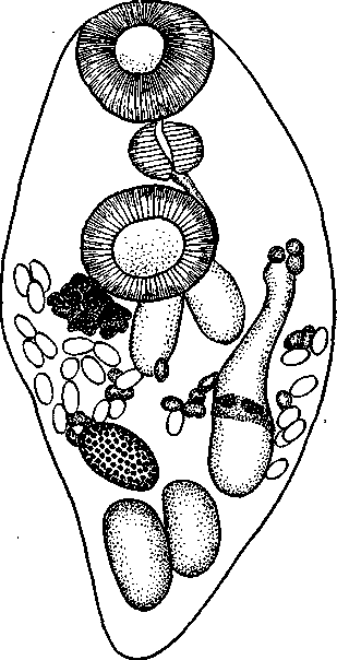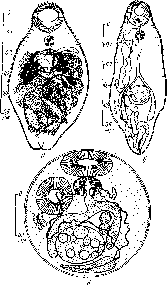а—Palaeorchis unicus Szidat, 1943 (по Сцидату, 1943); б — Cercariaeum helveticum I Dubois, 1929 (по Дюбуа, 1929 из Сцидата, 1943). Предполагаемая личинка Palaeorchis sp.; в — Cercariaeum paludinae-impurae Wesenberg-Lund, 1934 (по Везенбергу-Лунду, 1934 из Сцидата, 1943). Инцистированная стадия