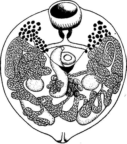 «Я определяю Physochoerus как представителя Monorchinae, двуполая генерация которого обладает сильно развитыми концевыми отделами половых протоков, двумя у середины тела находящимися семенниками, лежащими дорзально в передней половине тела и простирающимися до фаринкса желточниками, заполняющими задний отдел тела за семенниками маткой, отчетливо обособленной от метратерма, снабженного невооруженным, сильно расширенным слепым мешком».