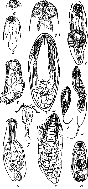 а — передний конец мирацидия с короной из перьевидных шипов; б — передний конец мирацидия (показано действие шипов при проникновении в кишечник моллюска); в — рисунок, изображающий слои тела на различных уровнях и их расположение у живых мирацидиев; з — молодая форма Halipegus eccentricus из желудка Rana pipiens; д — циклоп через 15 минут после внедрения в него трех церкариев Halipegus; е — живой метацеркарий; видны кишечные стволы с масловидными шариками; ж — пламеневидные клетки и зародышевые клетки мирацидия в яйце с крышечкой; з — яйцо с развитым зародышем из фекалий лягушки; и — вылупление мирацидия в желудочном соке моллюска; к — мирацидий в растворе Рингера; л — разрыв покрытой шипами оболочки после проникновения в кишечник моллюска для образования спороцисты; м — молодая форма Н. eccentricus