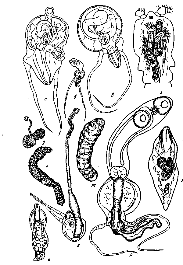 a — бульбус цистофороидного церкария с эксцистированным церкарием; экскреторный канал внутри бульбуса; б — эксцистированный и прикрепившийся церкарий; в — цистофороидный церкарий вскоре после выхождения из хозяина — моллюска; з — метацеркарий в полости тела Mesocyclops obsoletus (=C. leucartii) с вывернутыми ворсинками пузыря; д — образование экскреторного канала и пузыря у развивающегося церкария (экспериментальное заражение); е — редия с церкариями (экспериментальное заражение); ж — молодая редия при естественном заражении; з — спороциста с развивающейся редией (экспериментальное заражение); и — молодая спороциста с зародышевыми шарами; к — бульбус с вытянутым экскреторным каналом после поедания церкария циклопом; л — эксцистированный церкарий с вытянутым экскреторным каналом