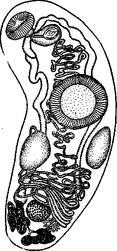 Экскреторный пузырь Y-образный, состоит из непарного экскреторного ствола, простирающегося от заднего конца тела вправо, где на уровне семенников разделяется на два латеральных ствола. Эти стволы простираются по обеим сторонам тела вперед; на дорзальной стороне фаринкса они соединяются.