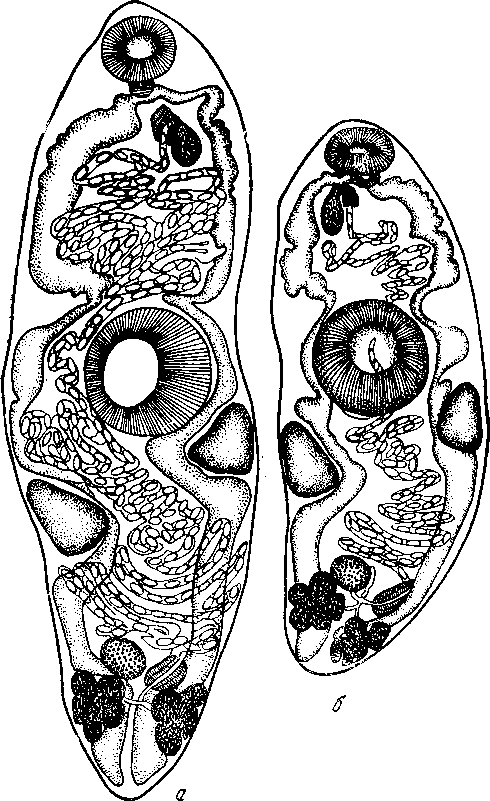 Субтерминальная, направленная в вентральную сторону ротовая присоска имеет поперечно-овальную форму; ее размеры 0,14—0,2 X 0,19—0,27 мм. Брюшная присоска расположена приблизительно у конца передней половины тела, сферической формы; ее диаметр 0,3—0,4 мм. Она в 1,5 раза больше ротовой присоски. Сферический фаринкс 0,08—0,1 мм в диаметре; он открывается в две широкие извилистые кишечные ветви, которые тянутся до самого заднего конца тела.