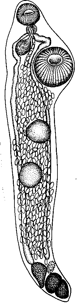 Halipegidae. Маленькие трематоды с гладкой кутикулой. Вокруг ротовой и брюшной присосок имеются кутикулярные кольцеобразные валики. Ротовая присоска субтерминальная. Брюшная присоска лежит в передней части тела. Имеются фаринкс и короткий пищевод. Кишечные стволы соединяются в заднем конце тела. Позади брюшной присоски лежат один за другим вдоль медианной линии тела два округлых семенника. За вторым семенником находится округлый яичник, а за ним один цельнокрайный округлый желточник. Гермафродитной бурсы нет. Имеется гермафродитный проток. Боковые экскреторные стволы соединяются у заднего конца фаринкса. Основной экскреторный ствол заканчивается сводчатой полостью, открывающейся наружу субтерминальным отверстием.
