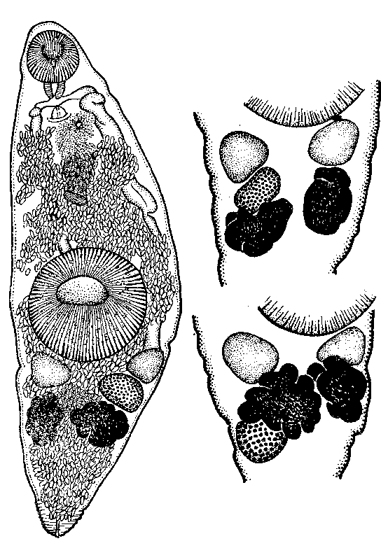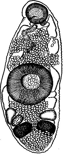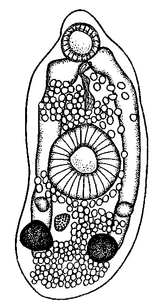 Яичник овальный, несколько больше в поперечнике, лежит непосредственно за правым семенником. Два больших компактных, лишенных лопастей, желточника лежат симметрично, одни непосредственно за яичником, другой за левым семенником, почти встречаются па середине. Матка заполняет большую часть тела, хотя не перекрывает заметно гонады; кпереди от брюшной присоски она иногда переходит через кишечные стволы, достигая края тела. Яйца большие, с плотной оболочкой, темного, золотисто-желтого цвета; их размер 0,064x0,036 мм.