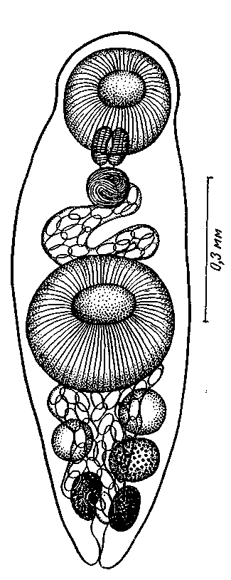 Яичник поперечно-удлиненный, 0,188—0,225x0,25—0,26 мм в диаметре, расположен постмедианно к правому семеннику у типа и медианно у паратипа. Семяприемник у типа небольшой и лежит непосредственно впереди яичника у медианного конца правого семенника, а у паратипа он очень большой, удлиненно-овальный и расположен непосредственно с правой стороны яичника, между правым семенником и правым желточником.