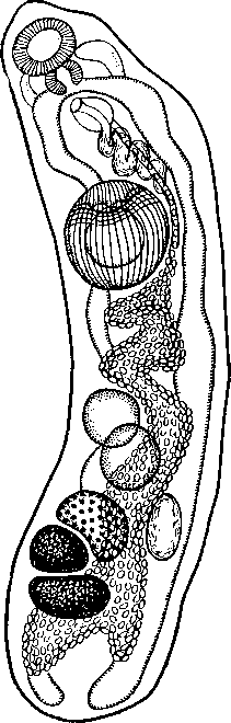 Тельце Мелиса лежит дорзально позади яичника. Имеется очень большой овальный семяприемник 0,2 х0,15 мм в диаметре. Он расположен между кишечными стволами, дорзально по отношению к яичнику. Желточники расположены наискось, один возле другого, непосредственно позади яичника, вентрально; передний из них находится слева и немного больше размером, чем задний. Расположенные близко одна к другой поперечные петли матки не доходят до заднего конца тела на расстоянии 0,19 мм, заполняя всю вентральную область. Эллиптической формы яйца 0,034—0,039 мм длины и 0,018—0,021 мм ширины.