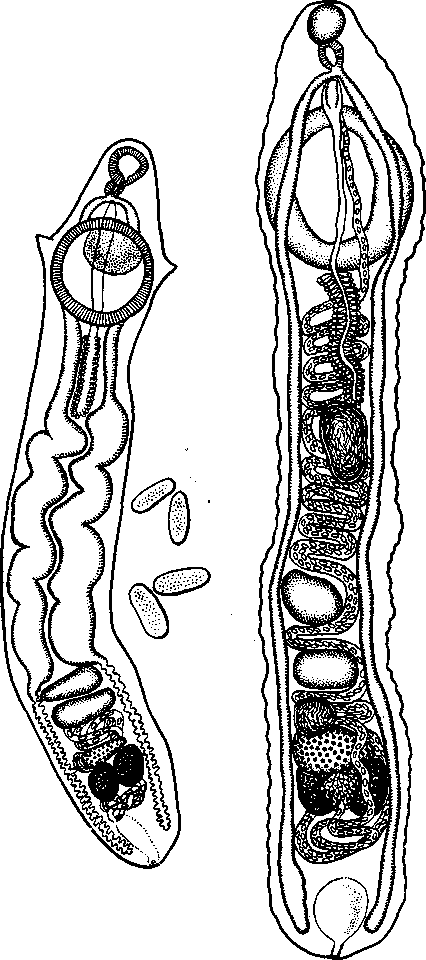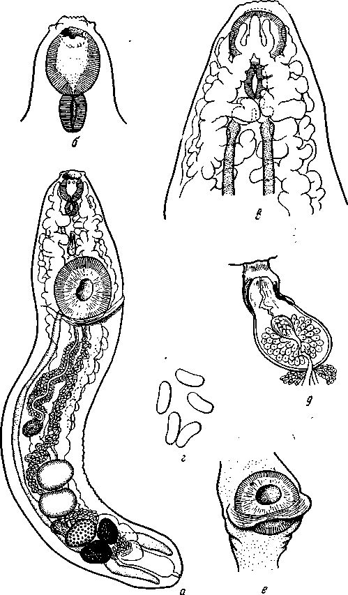 a — общий вид мариты; б — головной конец; в — передний конец с многочисленными отростками боковых экскреторных стволов; г — яйца; д — концевой участок полового аппарата; е — область брюшной присоски с поперечной мышечной складкой