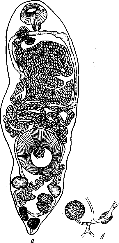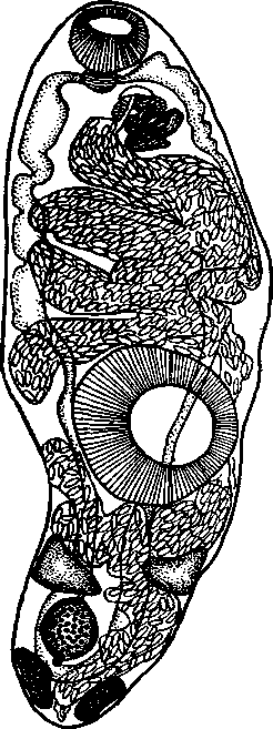 Семенной пузырек представляет собой удлиненную извитую трубку. Впереди он переходит в короткий семяизвергательный проток, соединяющийся с терминальной частью матки, образуя гермафродитный проток. Семяизвергательный проток окружен простатическими клетками. Яичник овальной формы, 0,14—0,2 х 0,17— 0,19 мм в диаметре, расположен интрацекально, сейчас же за правым семенником. Тельце Мелиса, 0,14—0,19 х 0,16—0,17 мм в диаметре, лежит рядом с задним краем яичника.