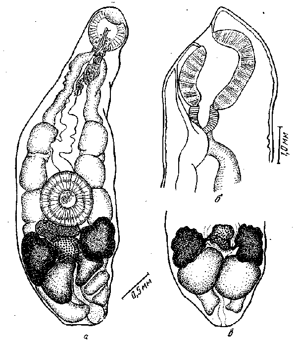 a — общий вид мариты; 6 — головной конец; в — задний конец