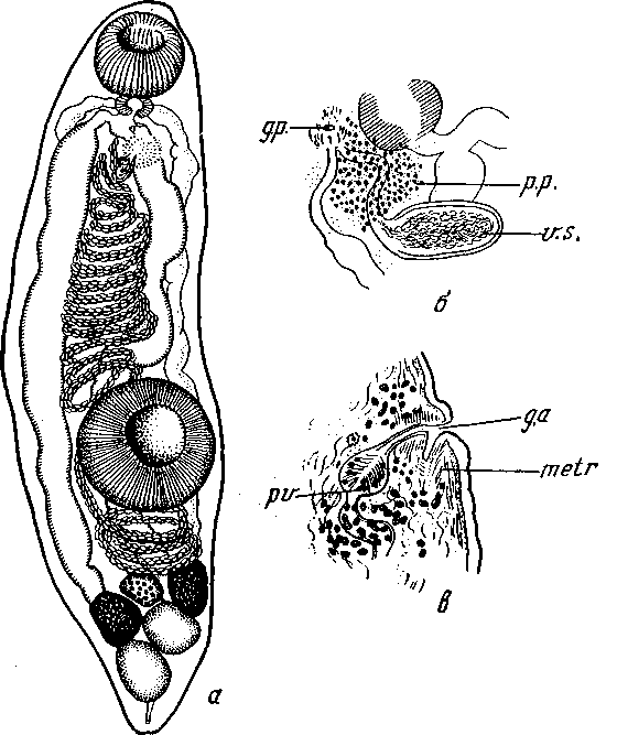 a — общий вид мариты; б—концевой участок полового аппарата; в — сагиттальный срез концевого участка полового аппарата; g. a.— половой атриум; g. p.— половое отверстие; pv— простатический пузырек; metr — метратерм; р. р. — простатическая часть; v. s.— семенной пузырек