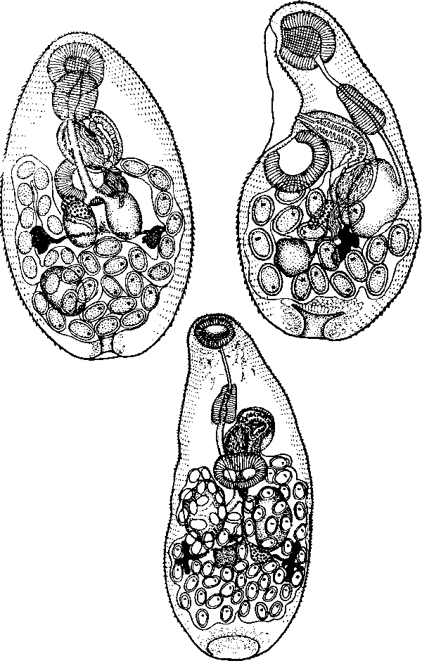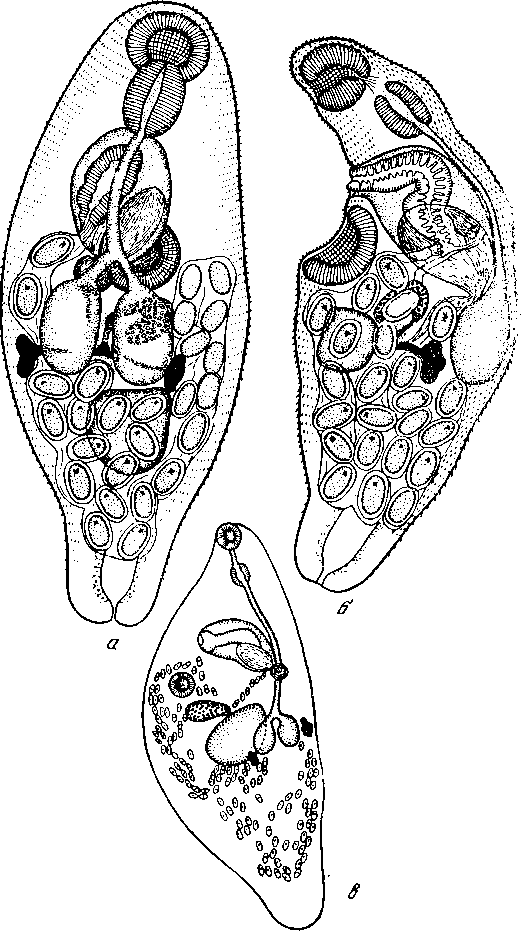 Saccocoelium tensum Looss, 1902 (а и б — по Лооссу, 1902; в — по Власенко, 1931 от Mugil cephalus)