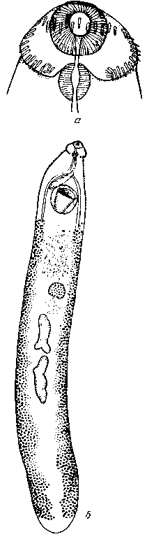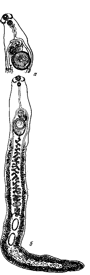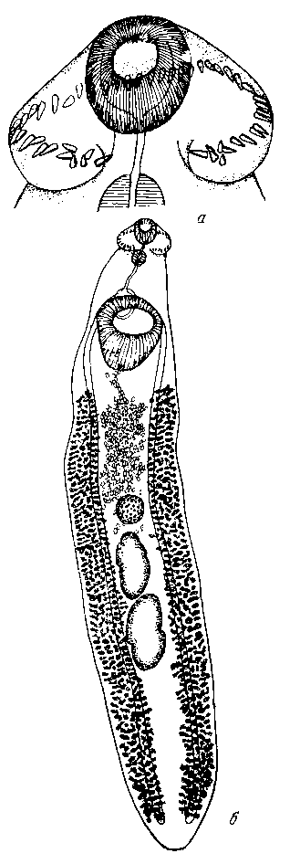 Пищевод 0,42—0,68 мм. Расстояние между центрами присосок колеблется от 1,04 до 1,35 мм. Брюшная присоска удлиненная; ее размер 0,72—0,96 X 0,52—0,78 мм. Желточники, состоящие из мелких фолликулов, тянутся двумя боковыми полосами от заднего края брюшной присоски до конца тела, не распространяясь к срединной линии. Семенники лежат в задней половине тела, по срединной линии один за другим, 0,52—0,83 х 0,26—0,43 мм; они колбасовидной формы. Шаровидный яичник 0,28—0,30 мм в поперечнике, расположен на расстоянии 0,54—0,88 мм от переднего семенника и 4,52—4,94 мм от заднего края брюшной присоски. У заднего края яичника располагается продолговатоовальное тельце Мелиса (0,34 х 0,281 мм). Матка с многочисленными яйцами; их размеры 0,098—0,100 х 0,048—0,050 мм.