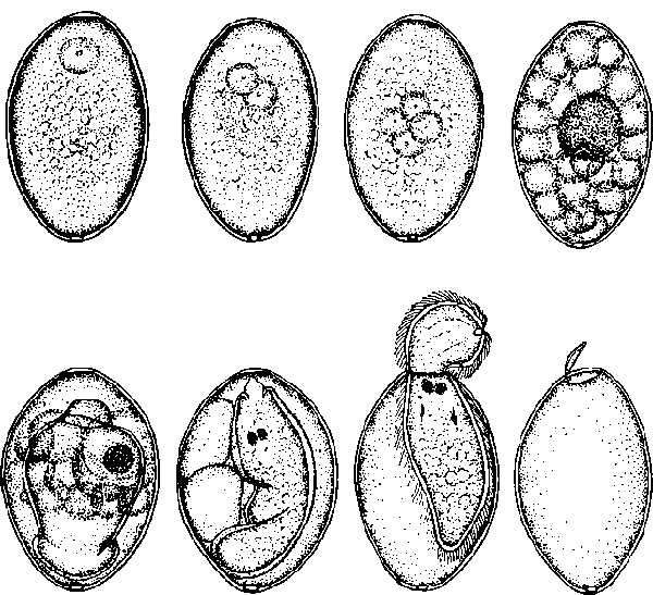 Echinostoma miyagawai Ishii, 1932 (по Невоструевой, публикуется впервые). Яйца на разных стадиях развития