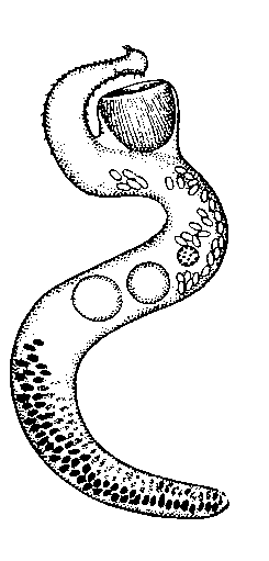 Шаровидная или поперечно-удлиненная ротовая присоска достигает в длину 0,15—0,25 мм при ширине 0,21—0,26 мм.