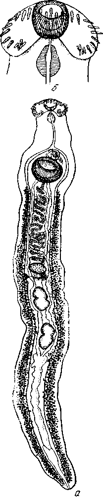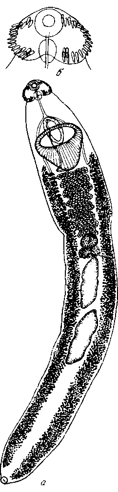 Головной конец несет почковидный воротник с сидящими на нем 39 прямыми шипами, срезанными при основании и расположенными двойным рядом. Из них 21 дорзальный шип одинаковой длины — 0,159 мм, при ширине 0,035 мм. Пять угловых шипов, сидящих с каждой стороны в угловых лопастях воротника, достигают лишь 0,127 мм длины, имея одинаковую ширину с дорзальными шипами. Шип, расположенный на границе между угловыми и дорзальными, меньше последних. Шипов на кутикуле нет. Ротовая присоска круглая, диаметром 0,630 мм; отверстие ее 0,0319 мм ширины. Короткий префаринкс (0,158 мм длины) ведет в продольноовальный фаринкс (0,0424x0,339 мм). Пищевод длиною 1,80 мм. Кишечные стволы, огибая брюшную присоску, идут до заднего конца тела и покрыты фолликулами желточников. Желточники начинаются отступя от брюшной присоски на расстояние 0,106 мм и идут до заднего конца, оставляя по медианной линии свободное пространство. Диаметр круглых -фолликулов 0,08 мм.