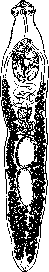 Короткая матка содержит около 15 яиц овальной формы; они достигают 0,091—0,094 х 0,052—0,055 мм.