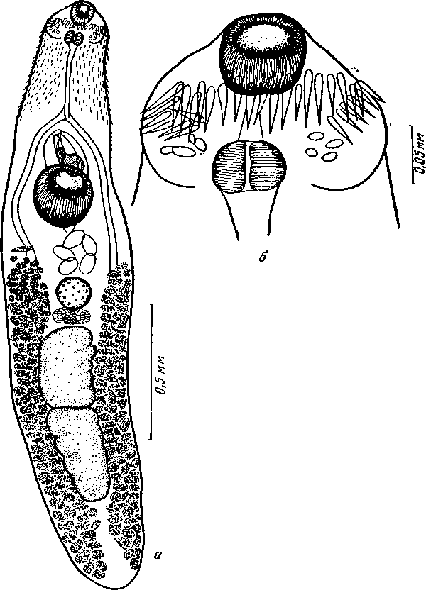 Описание вида (по Скворцову, 1934). Тело 8,916—10,592 мм длины и 1,158- 1,447 мм ширины. Адоральный диск 0,280—0,312 мм ширины, вооружен 37 крупными шипами в два ряда. На углах — по пяти шипов. Шипы аборального ряда крупнее таковых орального: размеры оральных — 0,044—0,062x0,012—0,016 мм, аборальных 0,056—0,076х 0,012—0,016 мм. Угловой шип, лежащий отдельно, ближе к срединной линии тела,— 0,044x0,016 мм. Ротовая присоска 0,077—0,190x0,0135— 0,270 мм. Брюшная присоска 0,501—0,617x0,463—0,772 мм.