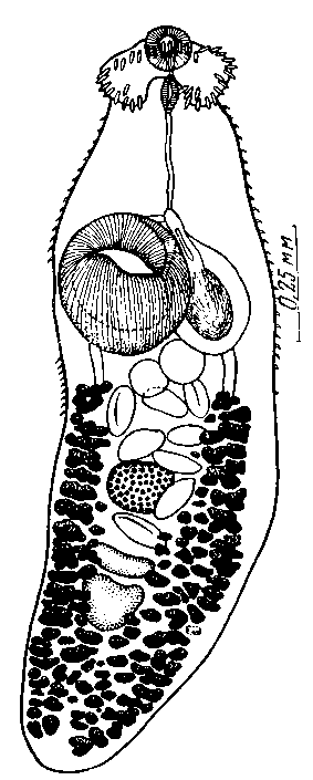 Семенники круглые, 0,105 мм в диаметре. Яичник 0,080 мм в диаметре; он лежит в середине пространства между брюшной присоской и передним семенником. Желточные поля начинаются от уровня яичника и доходят до заднего конца тела.