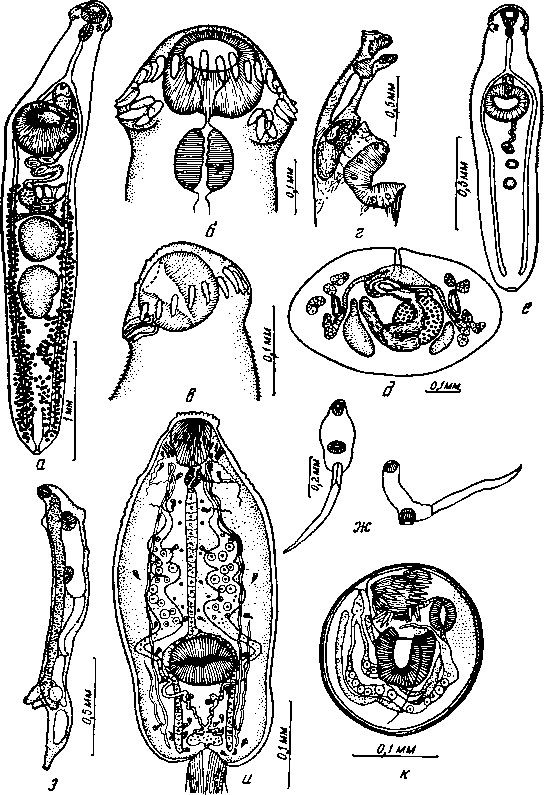 а — марита; б и в — головные концы; г — сагиттальный разрез передней части тела; д — схема женского полового аппарата; е — молодая марита; ж— общий вид церкариев; з — редия; и — передний конец церкария; к — метацеркарий