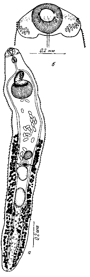 Описание вида (по Дитцу, 1910). Паразиты 4,5 мм длины, закруглены на обоих концах. Наибольшая ширина находится на уровне брюшной присоски и равна 0,38—0,41 мм. Почковидный головной воротник, имеющий в поперечнике 0,21—0,26 мм, вооружен 27 шипами, из них 19 располагаются двойным рядом по краю воротника, а восемь на угловых лопастях. Размеры краевых шипов 0,064 — 0,084 X 0,012 — 0,014 мм. Угловые шипы расположены попарно друг за другом и достигают 0,086—0,088x0,019 мм. Один из угловых шипов более крупный; его размер 0,096—0,108 X 0,021 мм. Ротовая присоска округлая и имеет в поперечнике 0,06—0,010 мм. Префаринкс длиною 0,07—0,10 мм переходит в хорошо развитый фаринкс 0,129—0,143x0,096—0,016 мм.