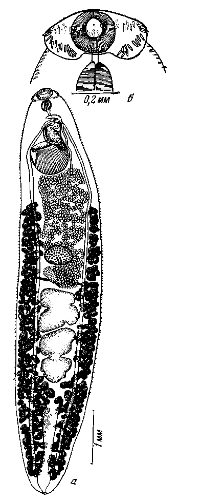 Относительно маленькая ротовая присоска, 0,18 мм в диаметре, расположена в центре адорального диска. Брюшная присоска 0,40—0,46 мм в диаметре, лежит в начале расширенной части тела. Фаринкс расположен почти внутри ротовой присоски, достигает в длину 0,17 мм и в ширину 0,11 мм. Фаринкс ведет в короткий пищевод, раздваивающийся впереди брюшной присоски; кишечные стволы тянутся почти до заднего конца тела и оканчиваются слепо. Экскреторная система не исследовалась.
