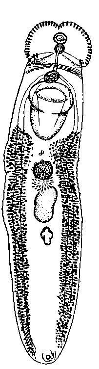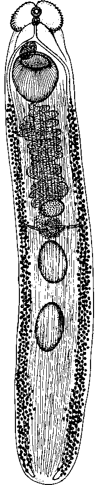 Маленькая ротовая присоска, 0,4x0,33 мм, ведет в префаринкс 0,06 мм длины. Фаринкс размерами 0,3x0,24 мм, переходит в пищевод 0,6 X 0,08 мм. Разветвление кишечника находится впереди брюшной присоски; ветви кишечника проходят к заднему концу тела. Брюшная присоска имеет продолговато-овальную форму; ее диаметр 1,7X1,1 мм. Половое отверстие лежит плотно перед брюшной присоской. Семенники располагаются по срединной линии один позади другого; они слегка лопастные и имеют неравные размеры. Передний семенник лежит в середине тела; его размер 1,0x0,56 мм, а заднего 0,5x0,26 мм; они отделены друг от друга пространством в 0,14 мм. Половая бурса лежит впереди брюшной присоски; ее размеры 0,48 X 0,14 мм.